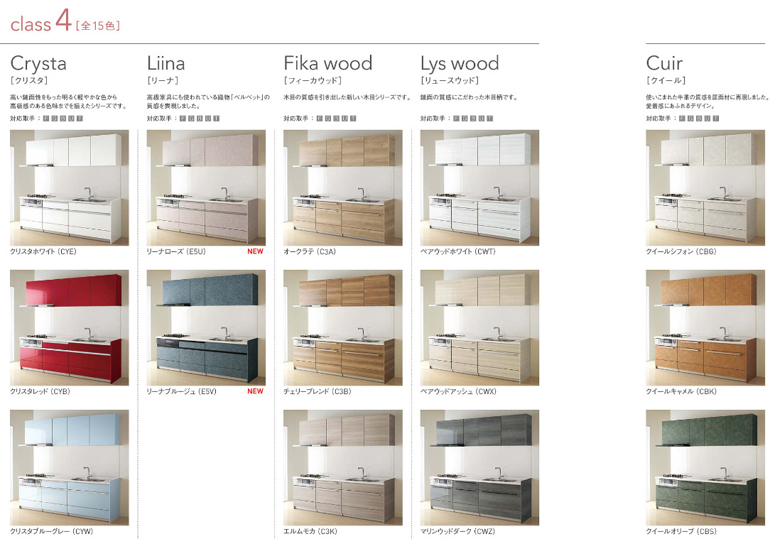 扉カラーについては両仕様で大きく異なっており、①木製キャビネット仕様でしか選べないオリジナルカラーがあります。